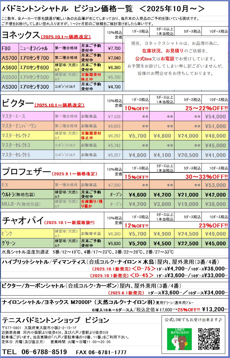(2025.8.24更新) 誠に恐れ入りますが、2025.10.1より、シャトルの再値上が始まります。 8月にヨネックス社のお値上が始まったばかりですが、今一度10月1日より再値上げが始まります。 たった2ヶ月後の、これまでの最短期間でのお値上となってしまいます。 そして今回は定価のお値上ではなく、卸率の引上げの為、ヨネックス社の公式サイトでの発表はございませんが、実質お値上との事です。 また更に、ビクター社、プロフェザー社のお値上も始まります。 重ねて恐れ入りますが、全メーカーのシャトルのお品薄が生じてしまっており、 「ヨネックス社-AS500」及び「ビクター社-マスターツー」は、暫く新規のご依頼をお受け出来ない現状です。 そして、他の殆どのお品も、毎月末の入荷分へのご予約を、1〜2ヶ月前に頂いている現状です。 全メーカー様にて、原毛調達が難しくなってきているとのことです。ご不便をお掛けしてしまい大変申し訳ございません・・・ ![]() ページトップへ |