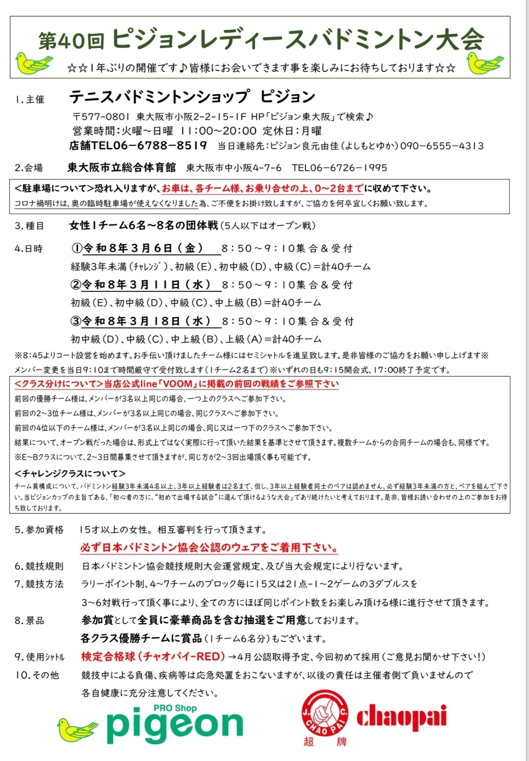 皆様、お久しぶりです、一年ぶりにご案内させて頂きます!東大阪市のバドミントンショップピジョンの良元(よしもと)です。
